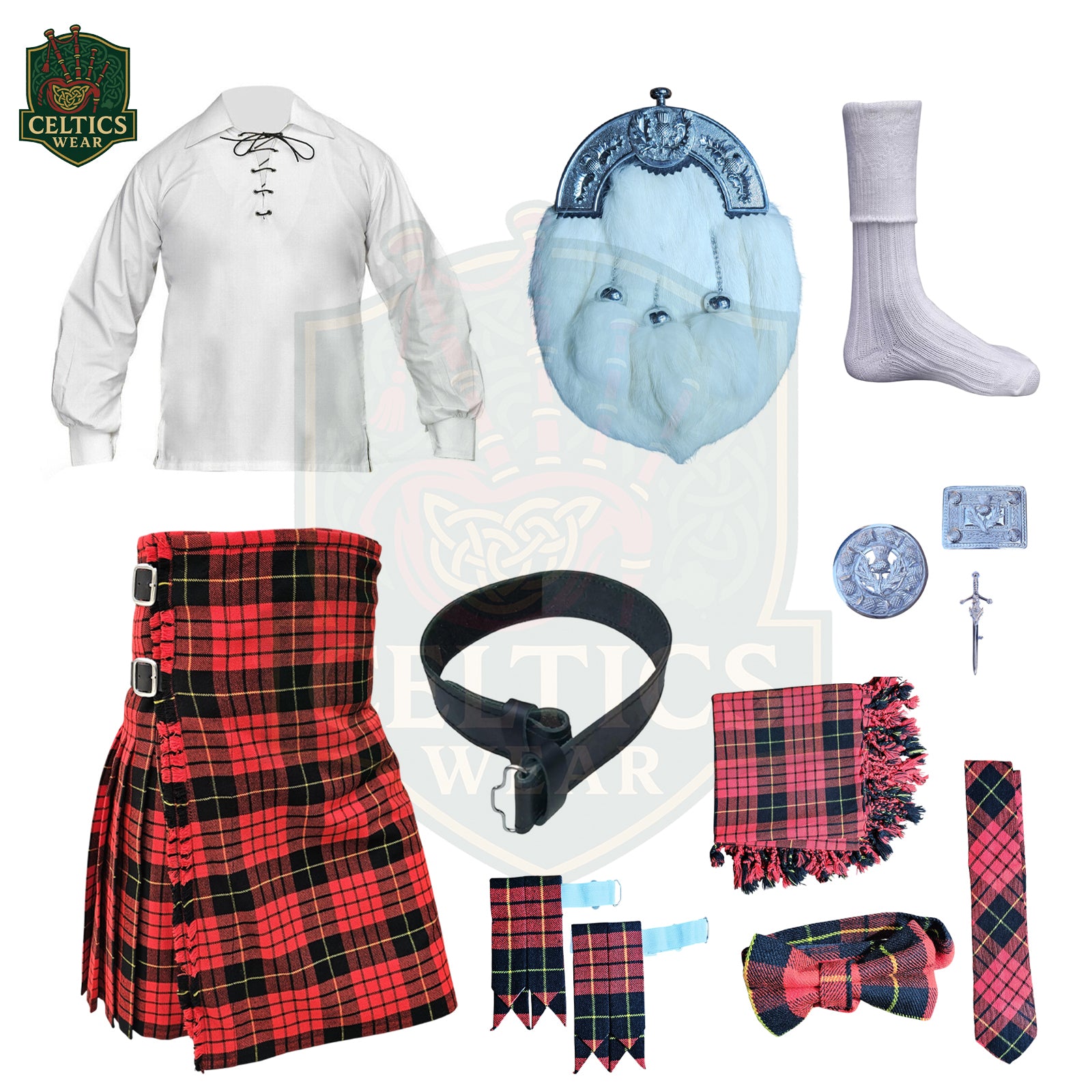Command attention with the bold and iconic McQueen Modern Scottish Bundle – a full Highland dress outfit that blends tradition with contemporary flair. This premium bundle includes everything you need to step out in complete Scottish style, featuring the powerful red and black McQueen tartan as its centerpiece.