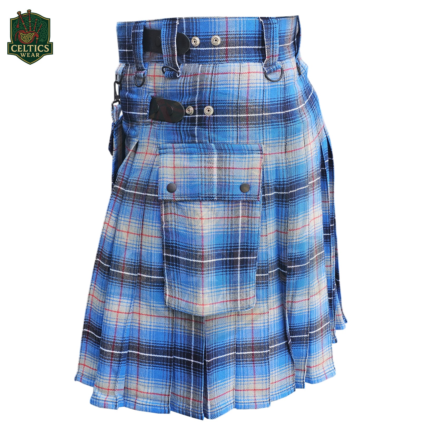 Step into a blend of timeless tradition and rugged functionality with the Blue Tartan Utility Kilt for men. Crafted for strength and everyday style, this kilt features a bold blue tartan base, functional cargo pockets, and leather straps with buckle closures that give it an edgy, tactical twist.