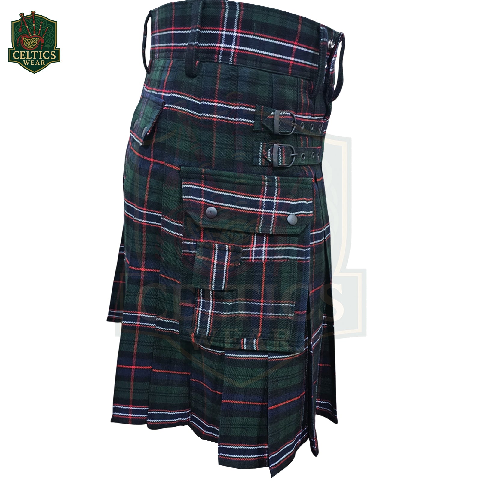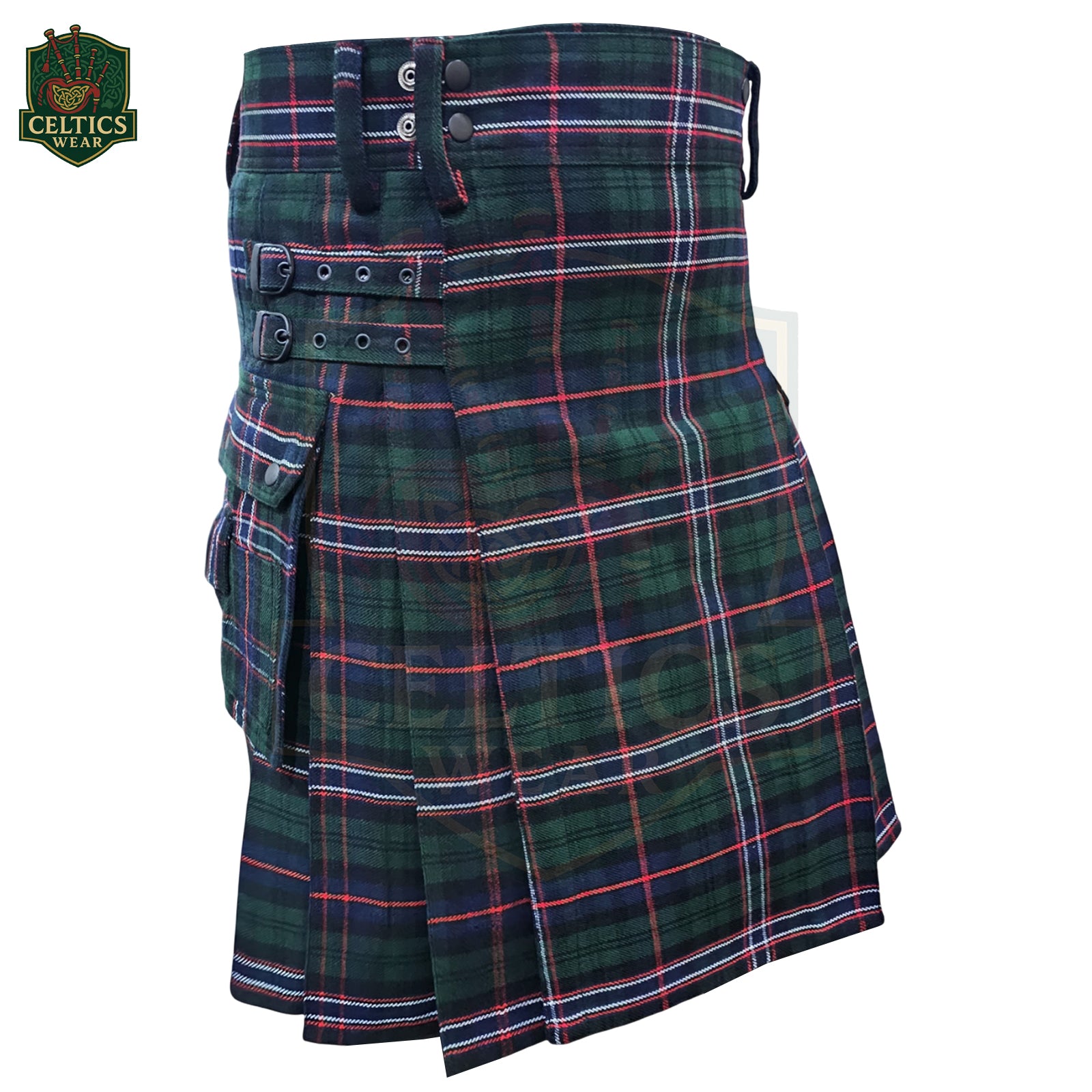 Crafted from premium acrylic wool blend or cotton (based on tartan selection) and equipped with cargo pockets, belt loops, and durable stitching, this kilt blends traditional heritage with rugged utility. It's perfect for festivals, casual wear, work environments, or custom ceremonial dress.