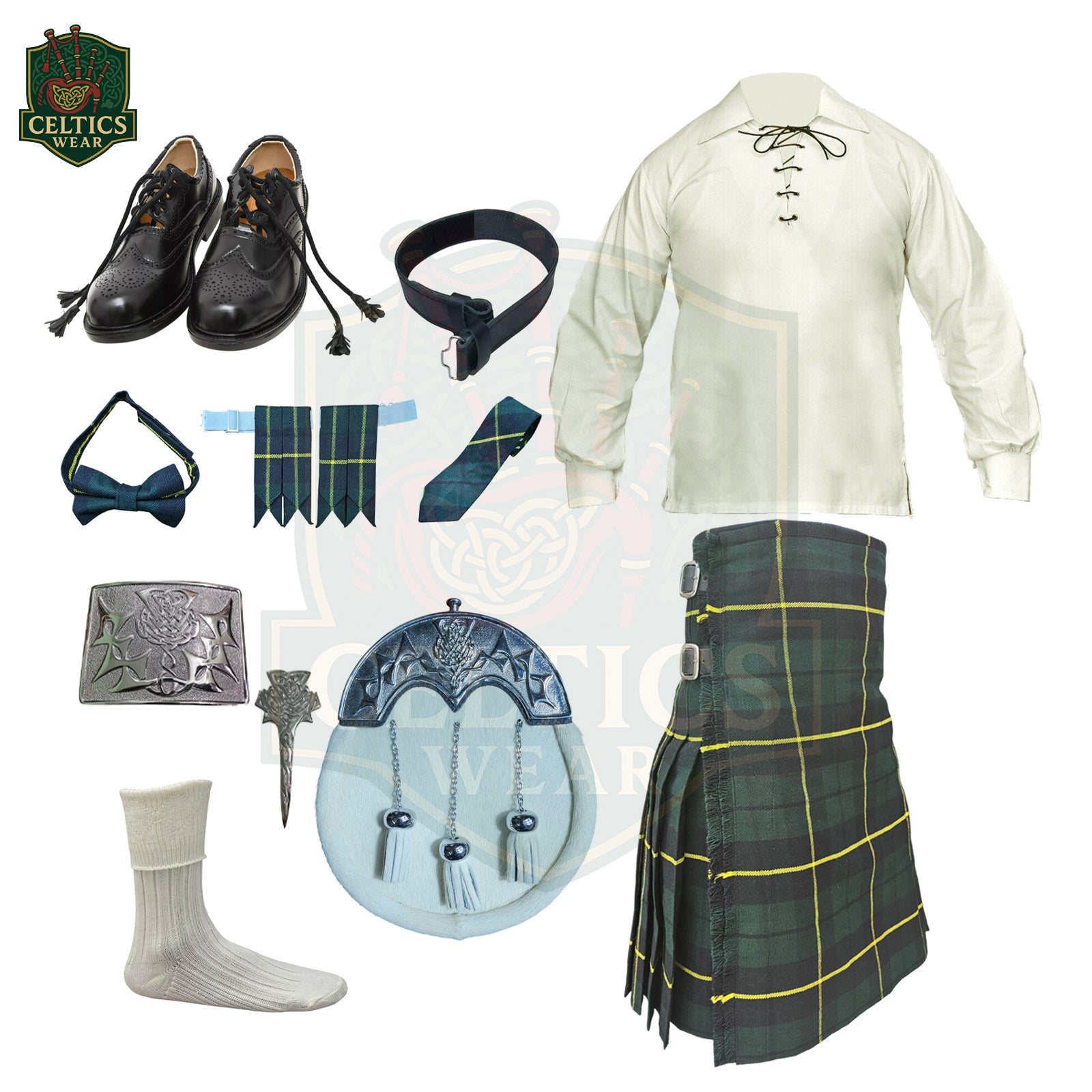 Embrace traditional Highland style with the Hunting Wallace Tartan Full Outfit Set. This 9-piece bundle includes everything you need for a complete Scottish look: a Hunting Wallace tartan kilt, matching fly plaid, sporran, kilt belt and buckle, brooch, flashes, kilt pin, Jacobite shirt, and kilt hose. Whether you're attending a wedding, Highland games, or cultural event, this coordinated set delivers unmatched Scottish heritage, comfort, and visual appeal. Crafted with quality materials and timeless design, it’s perfect for those who appreciate the legacy of the Wallace clan.